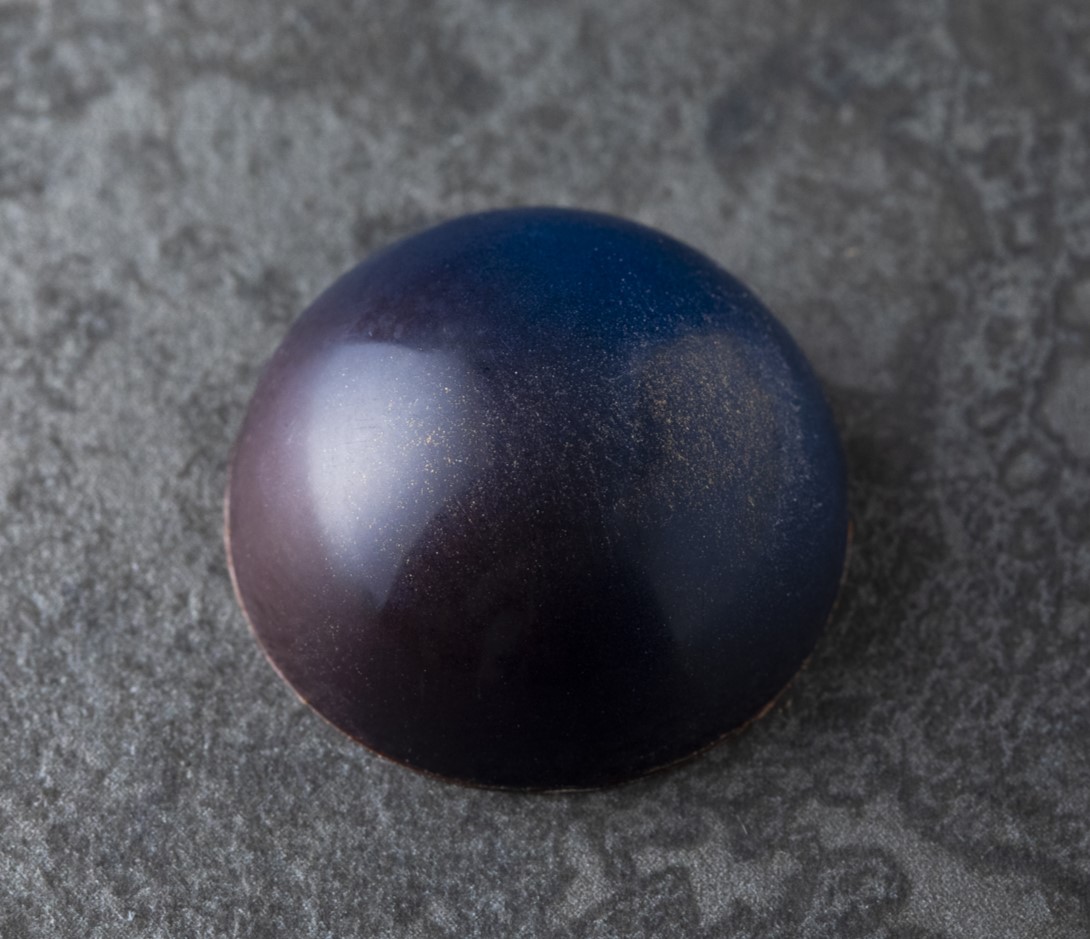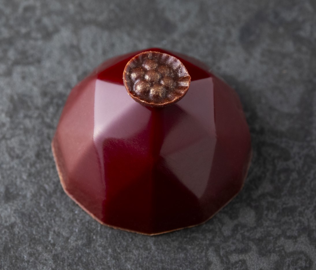 深みのある赤色が印象的なダークチョコレート。 爽やかな酸味のラズベリーとヴァローナ社のマンジャリを合わせたガナッシュの上に、「ポルトガルの宝石」と称されるポートワインに漬け込んだ白イチジクのコンフィを忍ばせました。ラズベリーの華やかな酸味とイチジクの凝縮した甘み、ダークチョコレートの力強いカカオ感が幾層にも重なり合う、奥行きのある味わいをお楽しみいただけます。 |