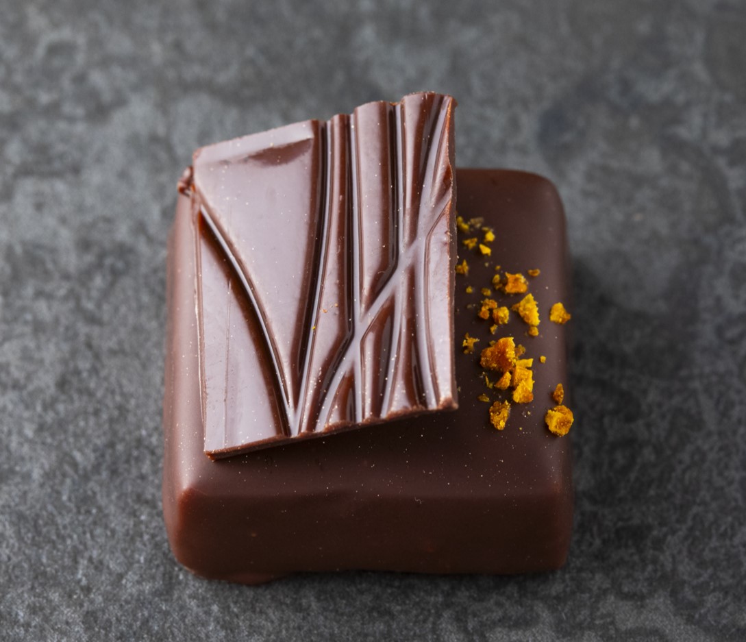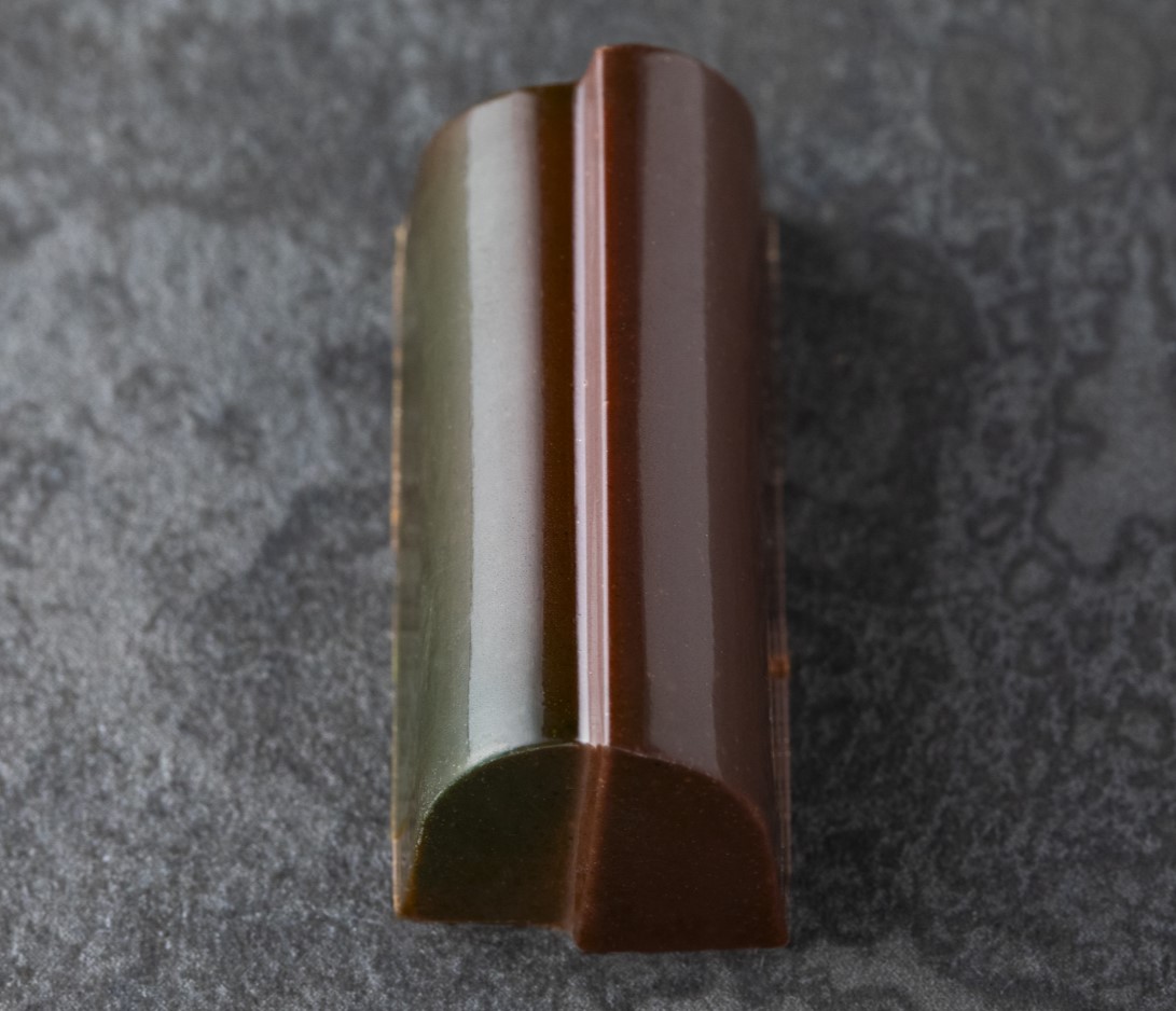 型を使用せずに仕上げたオレンジと紅茶の二層仕立てのチョコレート。それぞれ5mm幅で丁寧に重ねた上層には、ノーベル賞授賞式の晩餐会でも供される「セーデルブレンドティー」を贅沢に使用しました。バラを思わせる優雅な香りが広がるガナッシュに、下層のオレンジが穏やかな酸味を添え、なめらかな口どけに。仕上げに添えた自家製オレンジピールのほろ苦さが味わいに奥行きをもたらす、香りにもこだわり抜いたひと粒です。 |