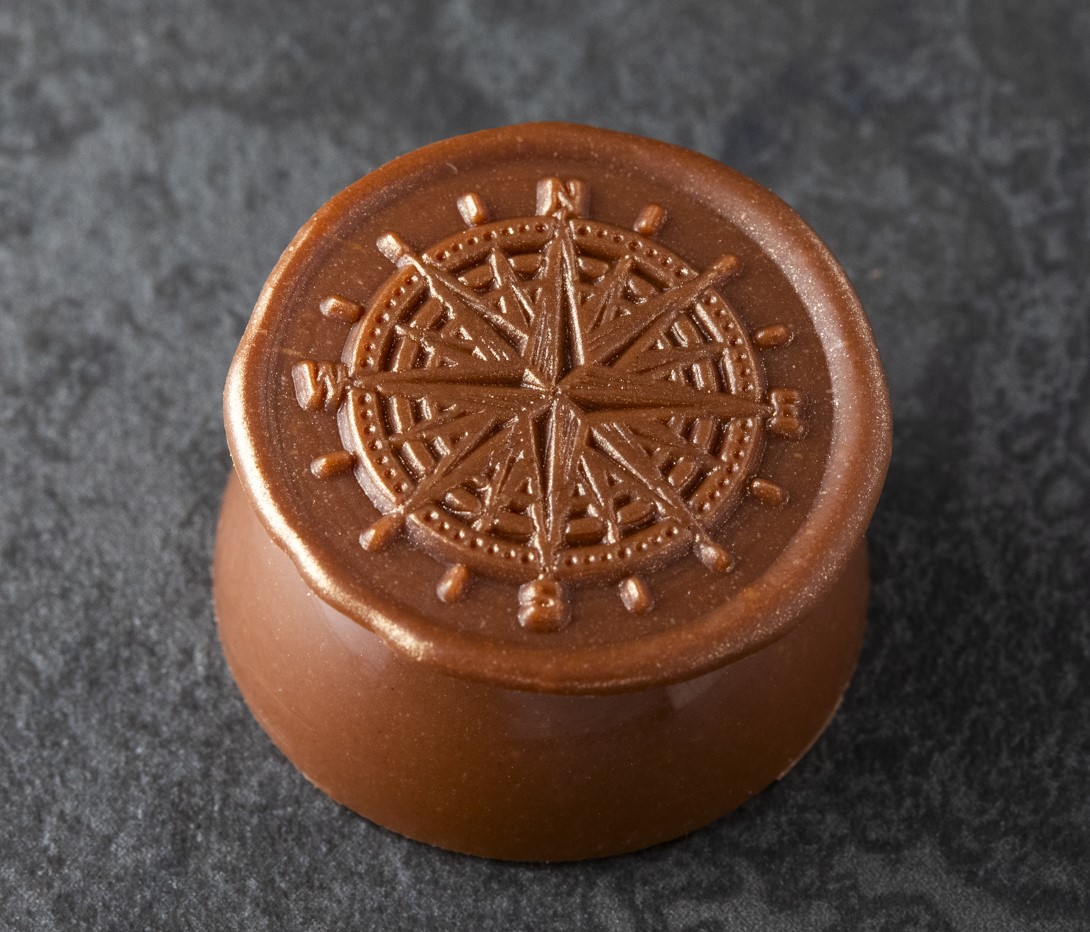口に入れた瞬間、とろりとあふれるキャラメルに岩塩のアクセントを加えたミルクチョコレート。岩塩の心地よい粒感が舌の上で広がり、キャラメルの濃厚な甘さを一層引き立てます。ひときわ目を引く"羅針盤"のデザインは、港町・横浜をイメージした象徴的なひと粒です。 |